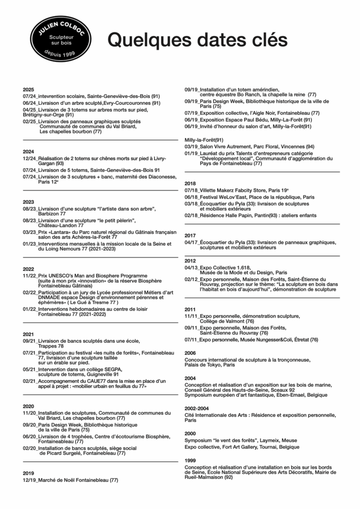 Julien Colboc est un sculpteur et valorisateur de bois depuis 1999. Il s’est installé dans la forêt près de Fontainebleau. Il est régulièrement invité à exposer ses œuvres, répond à des commandes privées et publiques, fait des démonstrations et initiations de travail du bois, intervient en milieu scolaire… Il emploie des savoir-faire ancestraux (haches, herminettes, planes) et contemporains (tronçonneuses, gravure laser). Il développe depuis quelques années, en plus de son travail de sculpture, un travail artisanal basé sur le bois vert : cuillères, petit mobilier. Depuis 2020 il est également tourneur sur bois et produit des bols, assiettes, saladiers, coupes à fruits et boîtes que vous pouvez acheter sur le site. Il est ouvert à toutes opportunités d’atelier, d’intervention, d’exposition et de chantiers de valorisation de bois abattu. Profitez de son expertise pour aménager des espaces extérieurs avec des sculptures, des bancs et des panneaux graphiques pédagogiques, de sa production, car il est également graphiste (projets à retrouver dans Réalisations).
